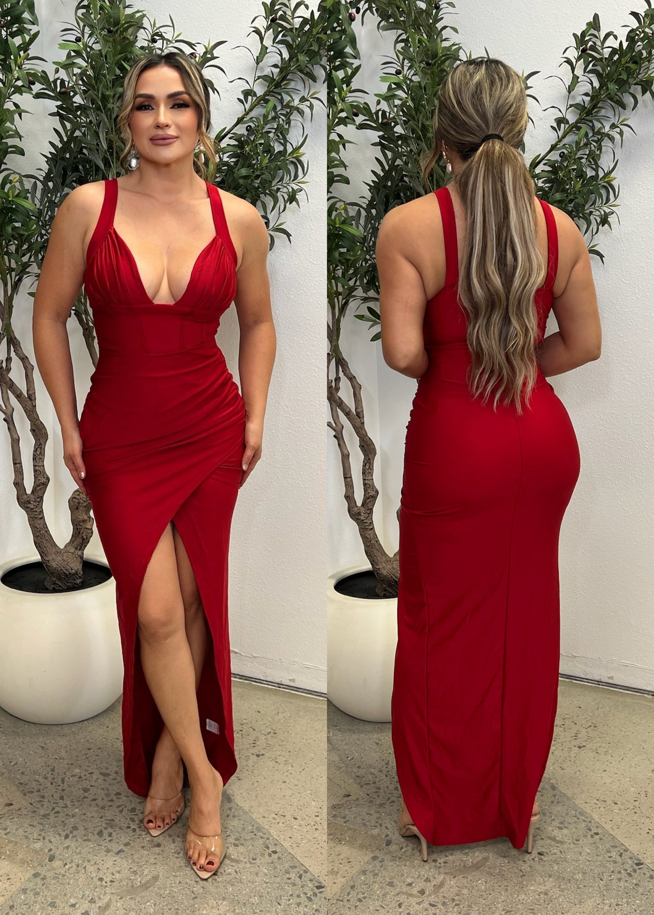 V-neck maxi dress with high leg slit