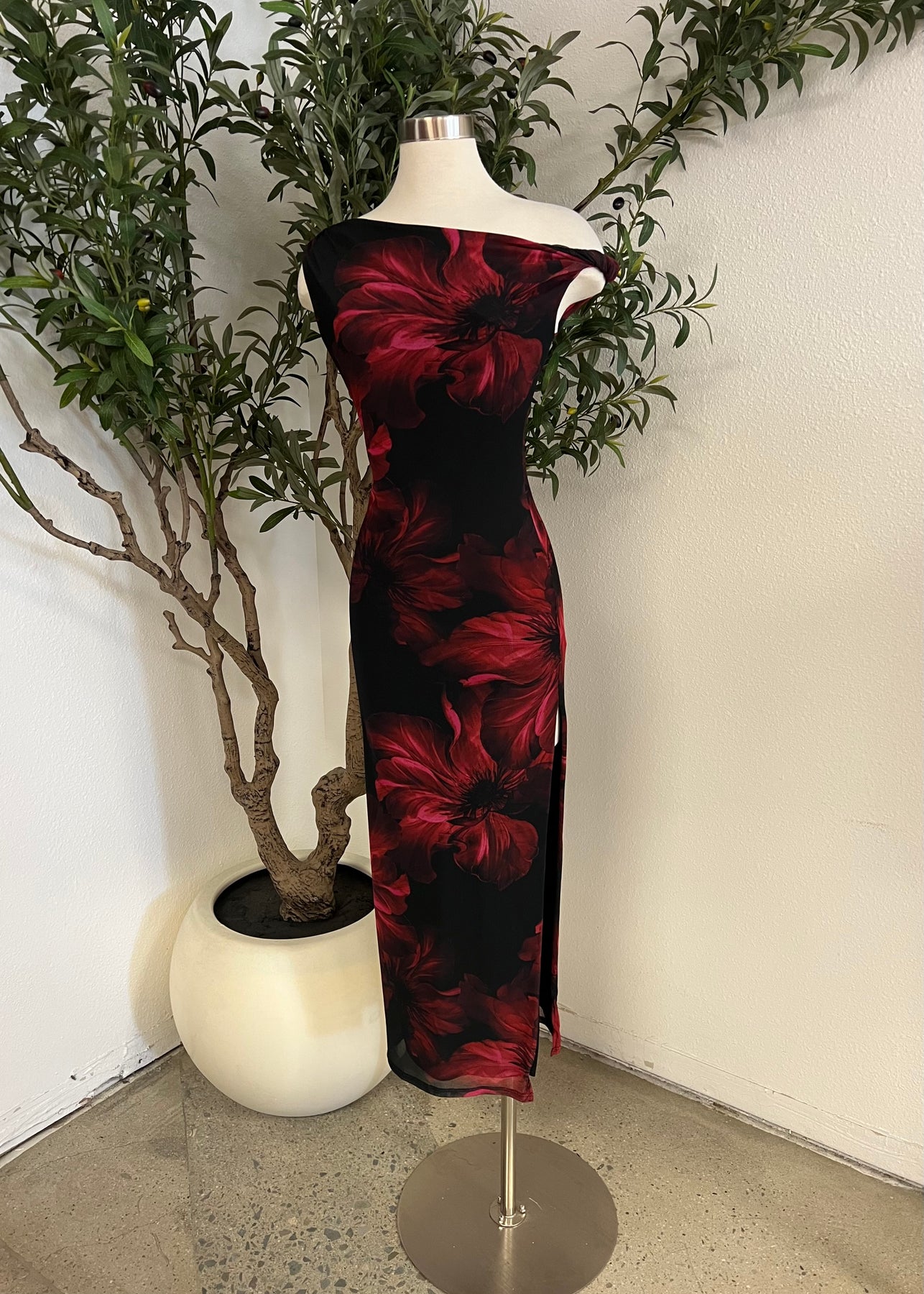Floral print dress with twist detail, double layered mesh material