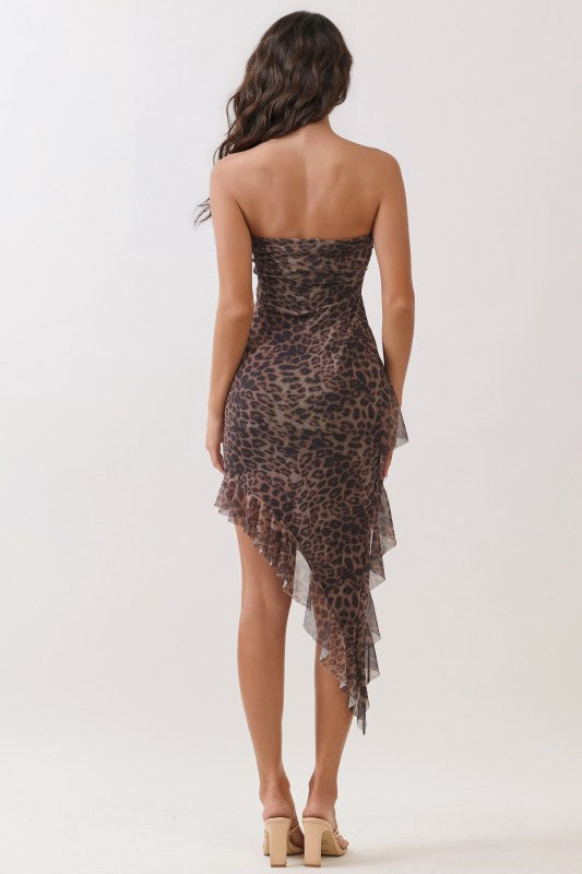 Strapless ruffled leopard print dress