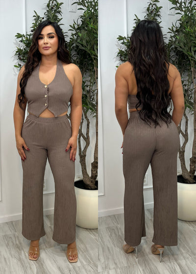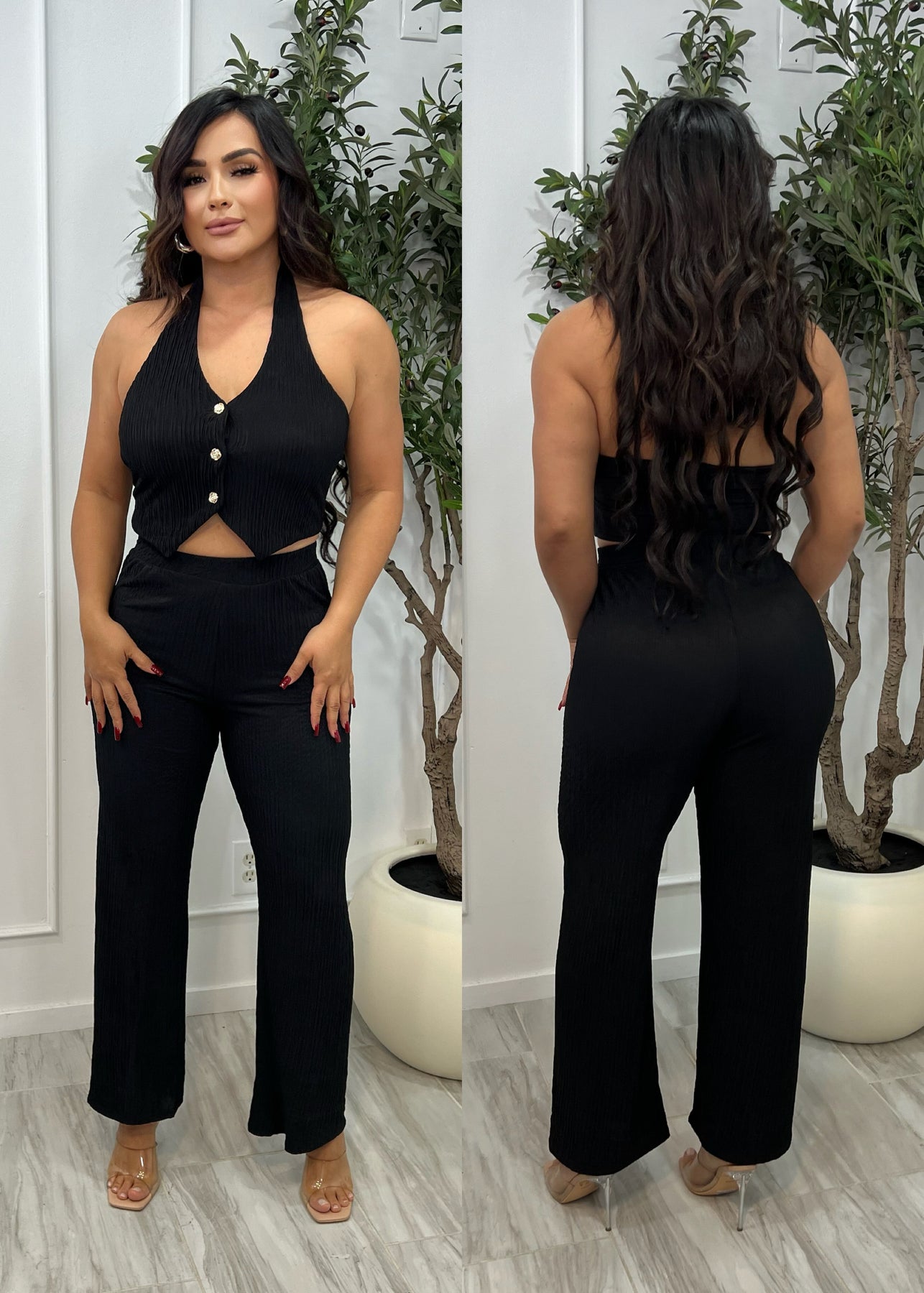 Suit yourself. With it's allover crinkled plisse motif, this stunning vest pants set makes quite the entrance. Features a Button down halter neck vest top in slight crop length and wide leg pants. Model is wearing size medium.