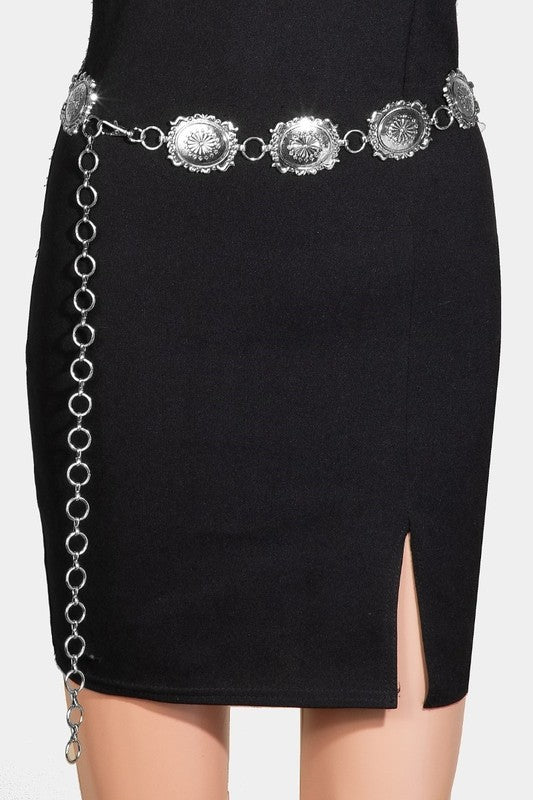 This chain belt introduces a unique almond concho style. Experience a subtle blend of modernity and classic charm as this chain belt effortlessly adorns your ensemble. THIS CHAIN BELT APPROXIMATELY MEASURES: LENGTH: 43 INCHES