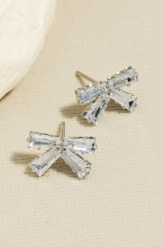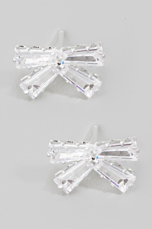 Cz Baguette Ribbon Bow Stud Earrings